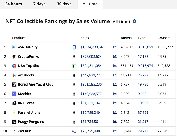 Axie目前是區塊鏈領域創收最高的NFT游戲,已經有較長時間占據銷售額榜首。無論是銷售額、購買者數量還是交易筆數,都遠超其他NFT項目。