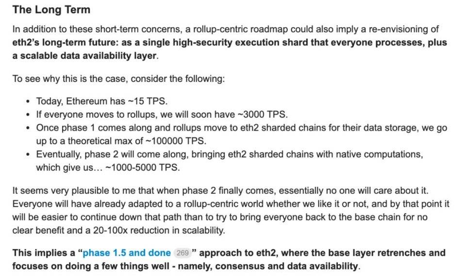 大約在這個時候,Vitalik 在 Ethereum Magicians 論壇上發表了長文,論述我們應該把短期和中期的擴容工作集中在 rollup 上。它們不僅會在階段 2 完成前上主網,還會是階段 1 的最大受益者。Rollup 會生成大量數據,而分片可以為它提供比 EVM 鏈消耗更低的存儲。下面是文章的截圖:
