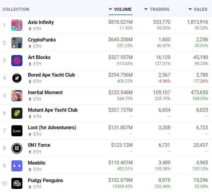 NFT 市場的火熱主要依靠部分熱門項目帶動起來。排名靠前的項目包括?Axie Infinity、CryptoPunks、Art Blocks、Bored Ape Yacht Club、Intertial Moment、Mutant Ape Yacht Clud、Loot (for Adventurers)、0N1 Force、Meebits、Pudgy Penguins 等。