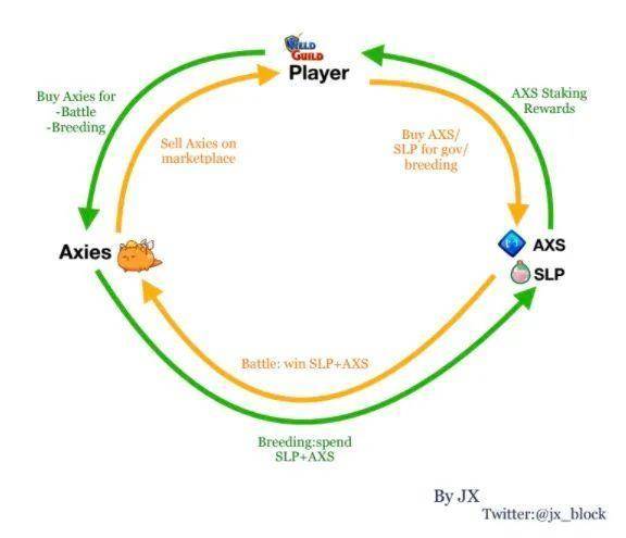 Play-to-Earn 是一種新模式,該模式獎勵玩家在玩游戲和發展游戲生態系統方面所花費的時間和精力。Axie 的經濟體系核心是戰斗和繁殖,并形成了一個由玩家,Axies (NFTs),和 AXS/SLP (原生代幣)組成的循環閉環。而 Axie 的經濟體系是 Play-to-Earn 的基礎。