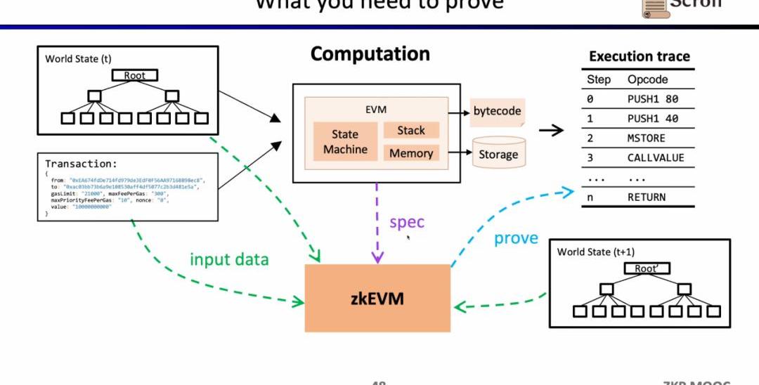 接下來,我們看zkEVM的完整流程,基于初始的全局狀態樹,一筆新的交易進來后,EVM會讀取存儲和調用的合約的字節碼,根據交易生成相應的執行蹤跡例如PUSH,PUSH,STORE,CALLVALUE,然后逐步執行更新全局狀態,得到交易后的全局狀態樹。而zkEVM是將初始的全局狀態樹,交易本身,以及交易后的全局狀態樹作為輸入,根據EVM的規范,來證明執行蹤跡的執行正確性。