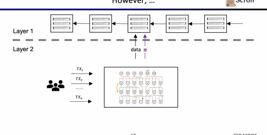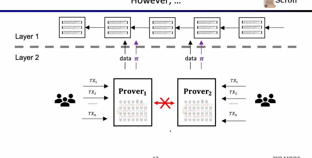 幸運的是,零知識證明的效率在過去兩年里已經大幅提高了,這也是為什么在最近兩年zkEVM變得如此受歡迎。至少有四個原因讓它變得可行,第一是多項式承諾的出現,在原先Groth16證明系統下,約束的規模非常之龐大,而多項式承諾可以支持更高階的約束,縮小證明規模;第二是查找表和自定義門的出現,可以支持更靈活的設計,使證明更加高效;第三是硬件加速方面的突破,通過GPU,FPGA和ASIC可以將證明時間縮短1-2個數量級,第四是在遞歸證明下,可以將多個證明壓縮成一個證明,使得證明變得更小更易于驗證。所以結合這四個因素,零知識證明的生成效率要比兩年前高出三個數量級,這也是Scoll的起源。