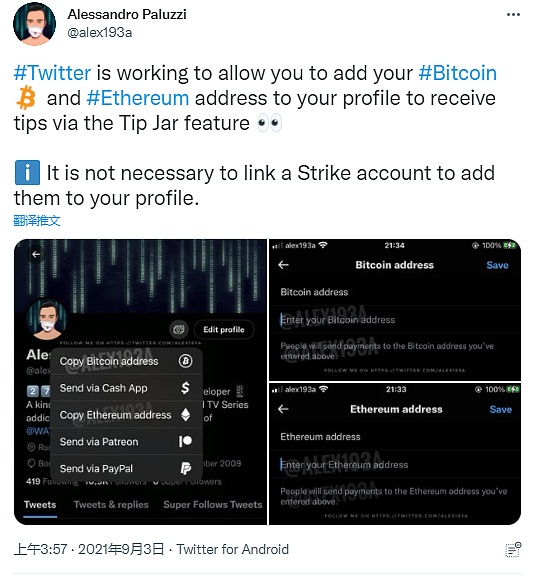 根據開發者AlessandroPaluzzi在9月3日發布的最新截圖,Twitter應用程序版本的設置工具欄中擁有比特幣和以太坊錢包地址選項。