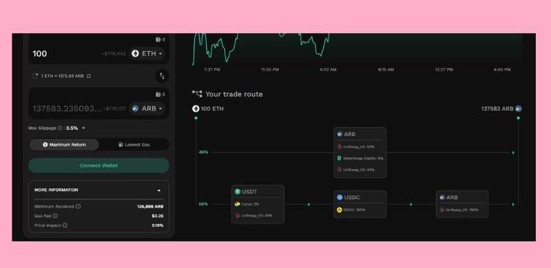 作者列出了幾個提供ARB流動性的DEX,包括KyberNetwork、TraderJoe、Uniswap和Camelot,并分別給出了它們的收益比較結果。值得注意的是,這些平臺之間的生態系統和激勵措施不盡相同,因此他們的收益也有所不同。在此基礎上,作者還詳細解釋了一些聚合器如何在這些DEX之間路由交換,以及他們的優缺點。