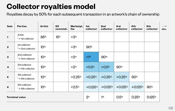 而該件藏品的第二位收藏家,將在作品再度轉售時獲得 0.5% 的收藏版稅,之后若再次轉手也依次遞減一半。同理第三位藏家在作品轉售時獲得 0.25% 的收藏版稅,以此類推。