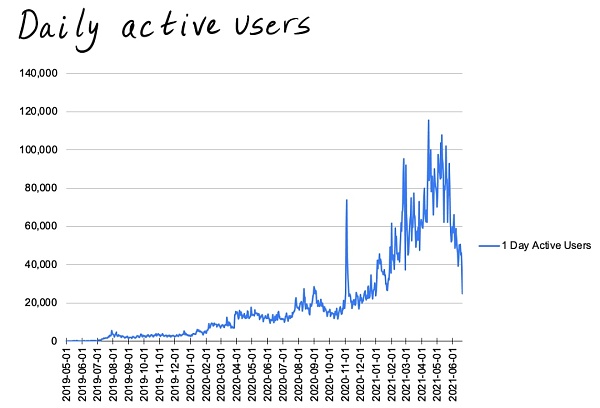 除了主站,我們也可以分別看一下美國市場 FTX.us 和被 FTX 收購的 Blockfolio 交易量。(從今年1月下旬到6月中旬)
