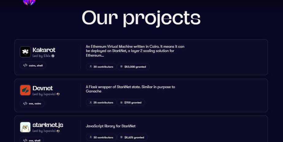 OnlyDust?是一個將開發者與StarkNet生態系統中的開源項目聯系起來的平臺。OnlyDust使開發者能夠幫助Kakarot、DevNet和starkNet.js等有意義的項目,并根據他們的貢獻價值每周獲得報酬。多虧了Warp,Solidity開發人員也可以參與其中。