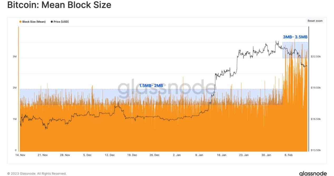 Ordinals對平均塊大小的影響也很顯著,平均塊大小的上限從穩定的1.5到2.0MB增加到上周的3.0到3.5MB之間。