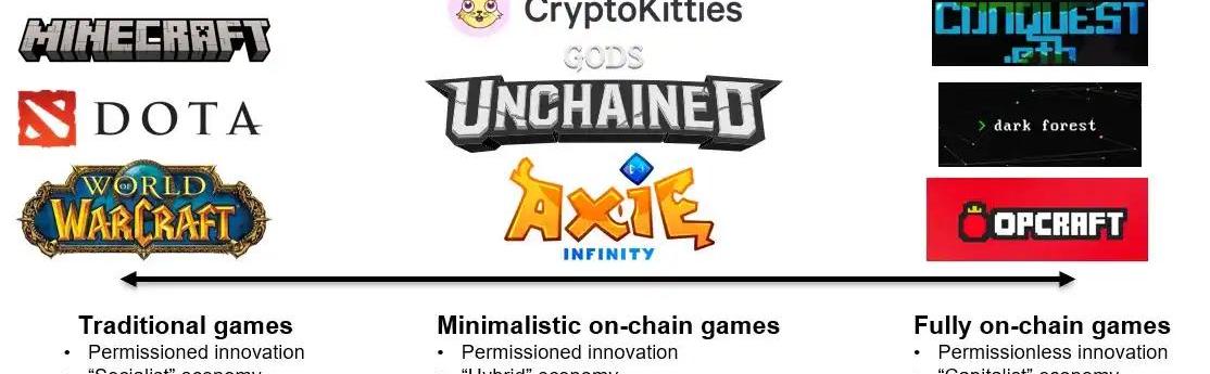 問題是,大多數區塊鏈游戲都沒有達到這個標準。像AxieInfinity或CryptoKitties這樣的游戲都是最低限度的鏈上游戲。他們的資產作為鏈上數據存在,但游戲的基本邏輯和狀態存在于鏈下的中心化游戲服務器。