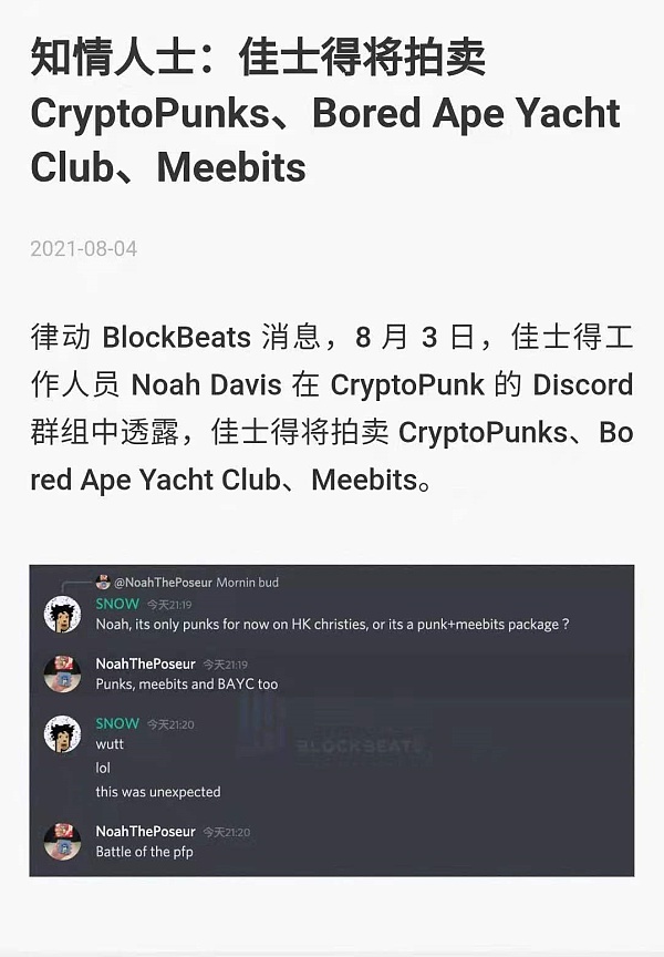 2021年8月3日,一則佳士得將拍賣Cryptopunks、BAYC、Meebits的消息在各大NFT社區流傳,這則消息徹底點燃市場,BAYC地板價格從5ETH左右一路飆升至10ETH。8月6日,佳士得官方發布公告,證實了此消息并非空穴來風,宣布將于9月17日開啟NFT拍賣,拍賣標的正是Cryptopunks、BAYC與Meebits,此時,BAYC地板價格已來到15ETH,猿猴寵物地板價達到2.8ETH。