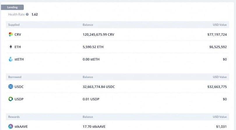 另一邊,也有聲音稱?0x57e?開頭地址是為了清算掉「防守者」?0x7a16?開頭地址的CRV抵押資產倉位。雙方多空博弈,散戶集結軋空,導致開啟鏈上清算。據DeBank數據顯示,截止目前,防守者?0x7a16?開頭地址當前在Aave中供應了價值7700萬美元的逾1.2億枚CRV以及5590枚ETH,負債為3266萬USDC,健康系數為1.62?。