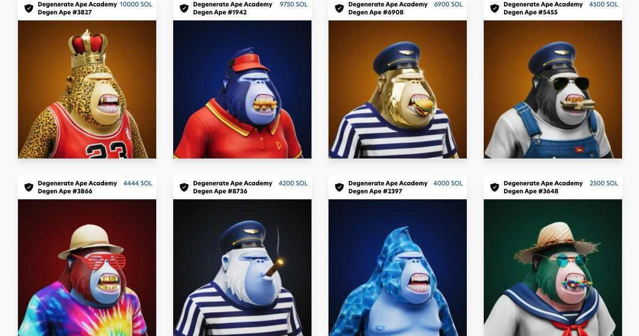 SolanaNFT始于2021年3月左右。這個市場內的一些og是Kreechures和solarian。緊隨其后的是首個基于生成藝術的SolanaMonkeyBusiness,當然還有于2021年8月推出的DegenerateApeAcademy,使Solana的nft成為眾人矚目的焦點,并創造了一種新的「藍籌」nft。