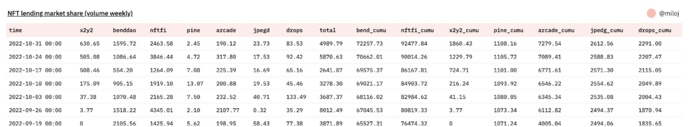 NFT借貸市場每周成交額,數據來源:Dune