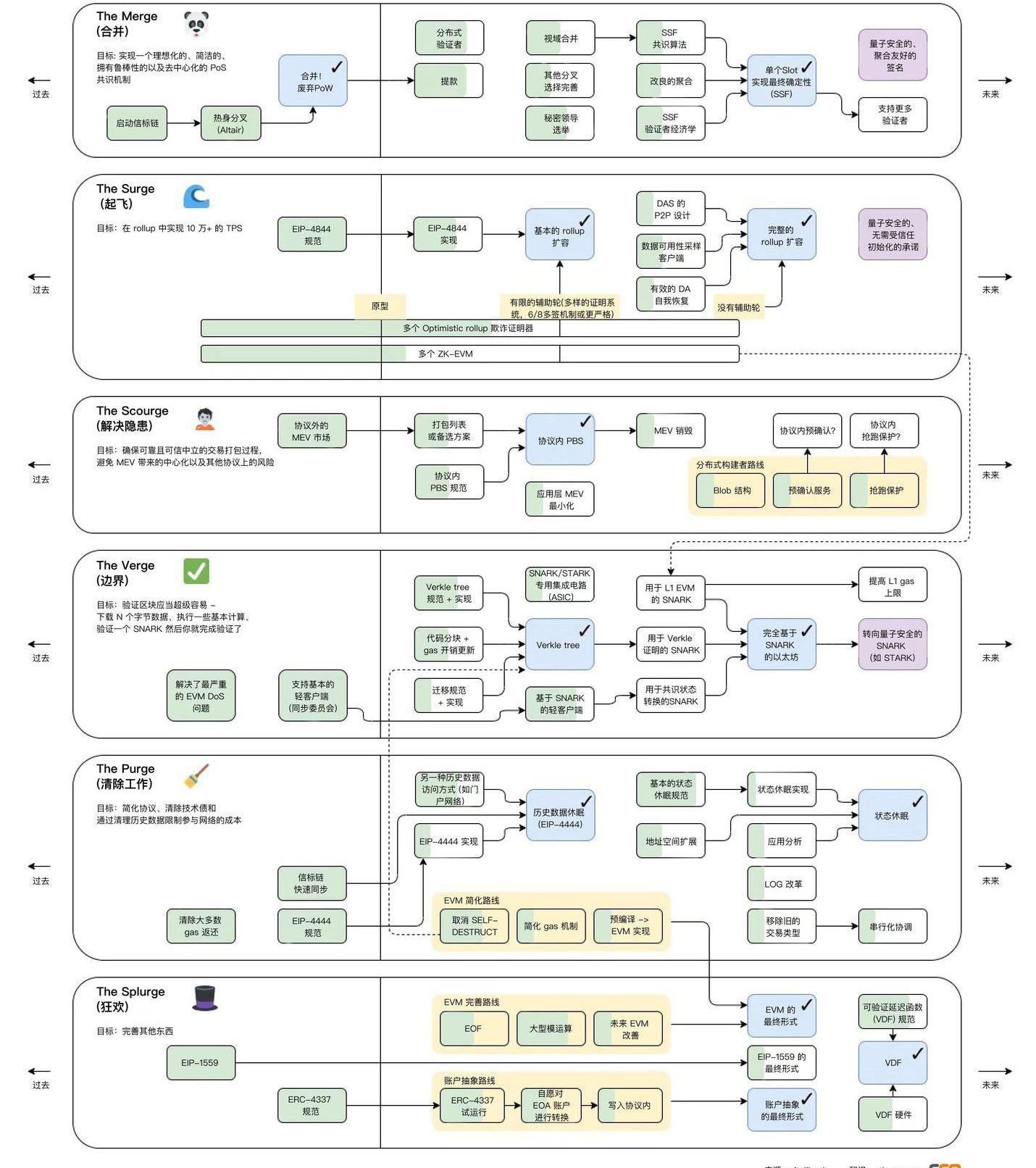 該路線的主要目標是推動以Rollup為中心的擴容。Surge指的是添加了以太坊分片,這是一種擴容解決方案,?以太坊基金會聲稱:該解決方案將進一步啟用低gas費的二層區塊鏈,降低rollup或捆綁交易的成本,并使用戶更容易操作保護以太坊網絡的節點。