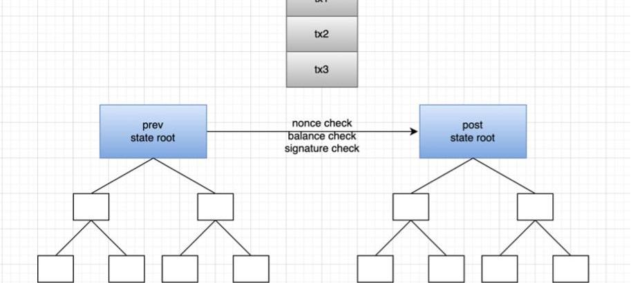 以zkrollup運行原理為例:在zkrollup中分為排序器和聚合器,排序器負責將用戶交易排序,并且將其打包成批次,發送給聚合器。聚合器執行交易,從前狀態根,生成后狀態根,然后生成證明,聚合器最后將前狀態根、后狀態根、交易數據,證明發送到L1上的合約,合約負責校驗證明是否有效,交易數據存儲在calldata內。Zkrollup數據可用性可以讓任何人能夠根據鏈上存儲的交易數據,還原出賬戶的全局狀態。