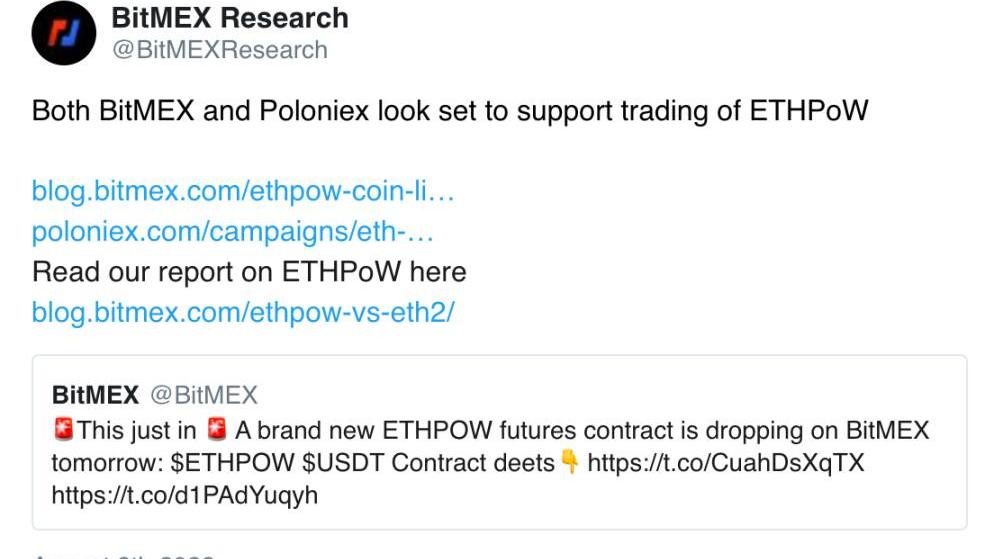 一些交易所,比如?BitMEX,已經宣布計劃支持ETHPOW交易。