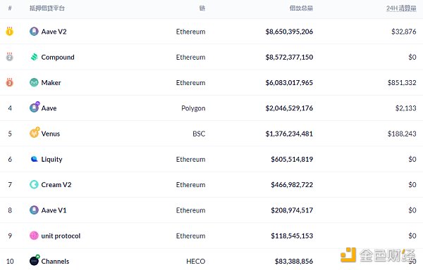 鎖倉量排名前十的借貸平臺 排名來源:Debank