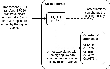 這種類型的錢包將有一個單一的簽名密鑰,用戶將使用它來發送交易和與dApps交互。但是,支持此簽名密鑰的是多個“監護人”,即其他以太坊地址。這些可以由家人或朋友保管,甚至可以由您的其他錢包維護。通過社交恢復,如果有足夠多的監護人批準,用戶的簽名密鑰可以在他們丟失或忘記如何訪問其原始密鑰時更新。