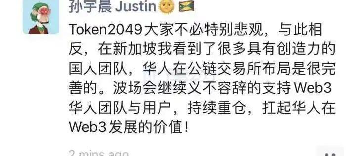 Token2049大家不必特別悲觀,與此相反,在新加坡我看到了很多具有創造力的國人團隊,在公鏈交易平臺布局是很完善的。波場會繼續義不容辭地支持Web3華人團隊與用戶,持續重倉,扛起華人在Web3發展的價值!
