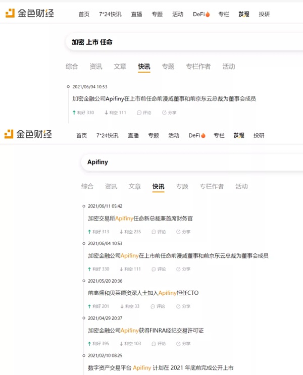 搜索“加密”、“上市”、“任命”這幾個關鍵詞,目前只搜到了Apifiny,一家美國的公司,做的業務似乎比較“生態化”,交易也做,做市也有,還有挖礦的算力幣,熱門領域都有所涉及。目前搜到的信息源,大多來自全球知名區塊鏈媒體Coindesk,筆者去查了原文鏈接,可信度高。
