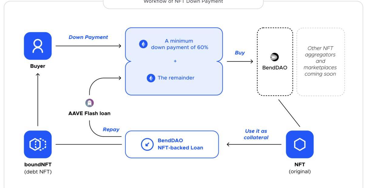 針對買方,可以理解為NFT首付。買方可以根據實際價格支付最低60%的首付,購買藍籌股NFT,同時從AAVE閃電貸來支付剩余部分。閃電貸款的借款金額將通過BendDAO上的NFT貸款來償還。買家將自動成為借款人,并支付首付款。而借款人也可以將其抵押的NFT掛牌出售。