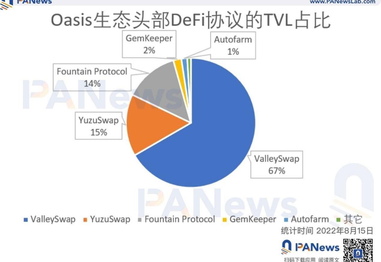 根據DeFiLlama數據,截至8月15日,整個OasisNetwork的TVL約為3000萬美元,排名前五的應用的占比高達近99%,包含3個去中心化交易所、1個借貸協議和1個收益聚合器。TVL排名第一和第二的分別為DEXValleySwap和YuzuSwap,前者的TVL約為2000萬美元,大約是整個生態的67%,后者的TVL約為460萬美元,大約占整個生態的15%。TVL排名第三的為借貸協議FountainProtocol,其TVL約為400萬美元,大約占整個生態的14%。