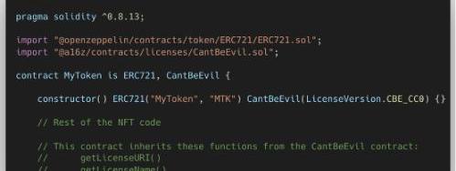 我們的CantBeEvil.sol合約在項目的智能合約中公開了getLicenseURI和getLicenseName函數,當被調用時,允許任何人查看適用于NFT的許可證書。