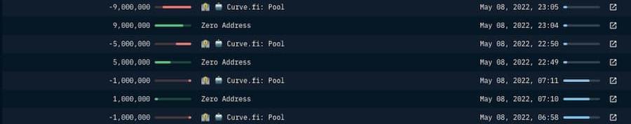 所有的交易記錄大多與UST和USDC有關,并在5月9日停止。最值得注意的交易是在5月7日將價值超過8500萬的UST與以太坊連接起來。這些代幣隨后被發送到Curve,并被換成了大約8450萬的USDC。