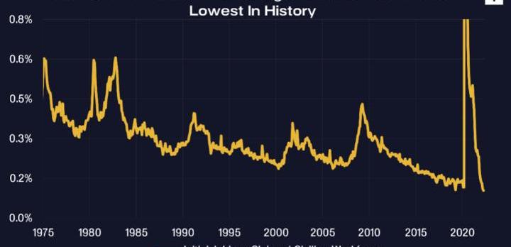 從就業角度來看,美國現在顯然已經遠遠超過了任何最佳就業水平。申請失業救濟的人數占平民勞動力的比例少于歷史上的任意時刻。