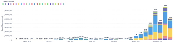 021年,去中心化永續合約交易平臺賽道進展飛快,伴隨著高速低廉的側鏈興起,2月Perpetual Protocol成為單日交易量超過1億的去中心化永續合約交易平臺。伴隨著ETH Layer 2的進展,8月底,DYDX的日均交易量成功的超過了10億。