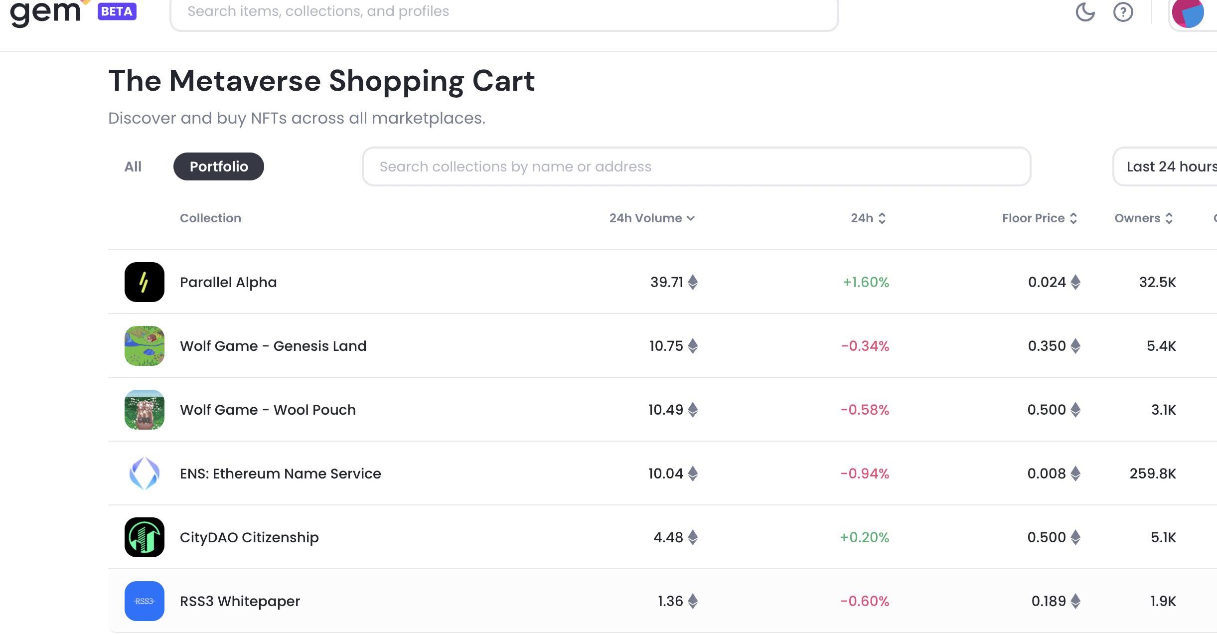 Gem在做的不僅僅是一個NFT聚合平臺,還是一個NFT投資組合管理平臺。在連接錢包后,Gem可以快速檢測用戶持有的NFT,將相關NFT系列添加到用戶投資組合中,并顯示關鍵的統計數據,如地板價和交易量等。