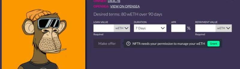 以當前較成熟的P2P平臺?NFTfi.com?為例,使用流程為?NFT?擁有者抵押?NFT?到平臺,填寫想貸的金額與期間。