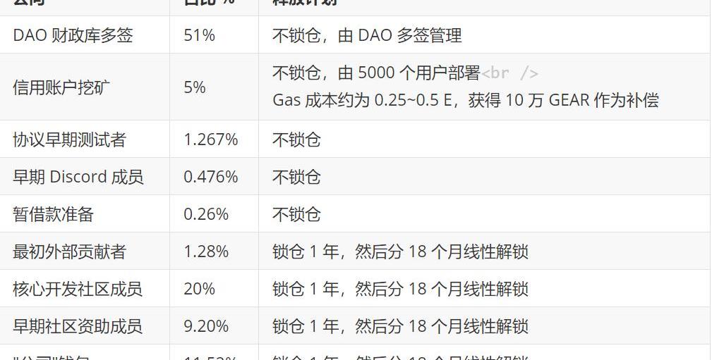 早期測試者以及?Discord?成員的空投代幣份額目前尚未決定如何施行,獎勵給信用賬戶挖礦用戶的代幣目前也處于不可轉賬狀態。因此目前?$GEAR?代幣尚未能在二級市場交易,由于?Gearbox?為社區驅動項目,因此屆時相關舉措將會通過?snapshot?提案進行投票決定。