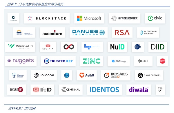 從發展歷程而言,分布式數字身份仍處于發展早期階段,現階段的數字身份仍多以中心化為主,聯盟身份、以用戶為中心為輔的身份形式。但盡管其發展較晚,由于其身份效率的優越性,眾多組織開啟了對其的探索。目前國內外已經問世的和分布式數字身份相關的項目已經超過 200 個,其中,分布式數字身份基金會DIF表現亮眼,成員已包括 IBM,微軟,NEC,埃森哲,超級賬本,R3,以太坊企業聯盟,金融機構 MasterCard,微眾等70余家知名企業。萬維網聯盟W3C也于2019年成立了DID工作組,專注于分布式數字身份DID的規范制定。