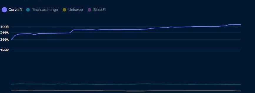 當前,stETH的流動性主要在Curve的stETH/ETH池中,占據stETH流通量中的75%,累計有443,659枚ETH,價值約10億美元左右,流動性強,價格穩定性較好,可支持大額交易。交易量增長趨勢平穩,如下圖: