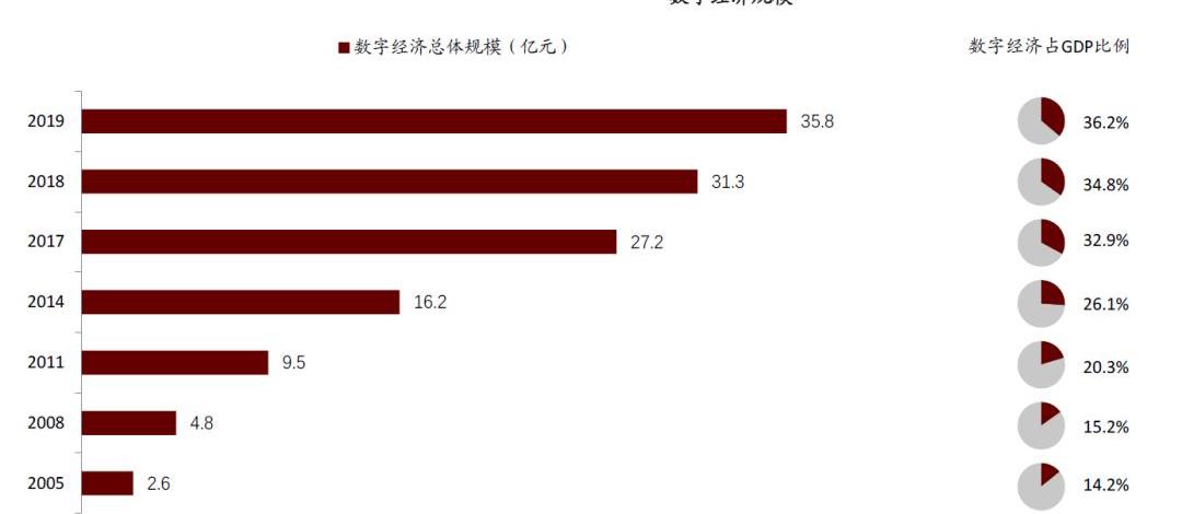 數字經濟發展加速,數字貨幣在線上鏈接起居民、企業和金融機構。據中信信息通信研究院數據測算,2019年我國數字經濟增加值規模達35.8萬億元,占GDP比重的36.2%,電商網購、網絡直播等新興數字產業依然不斷涌現。