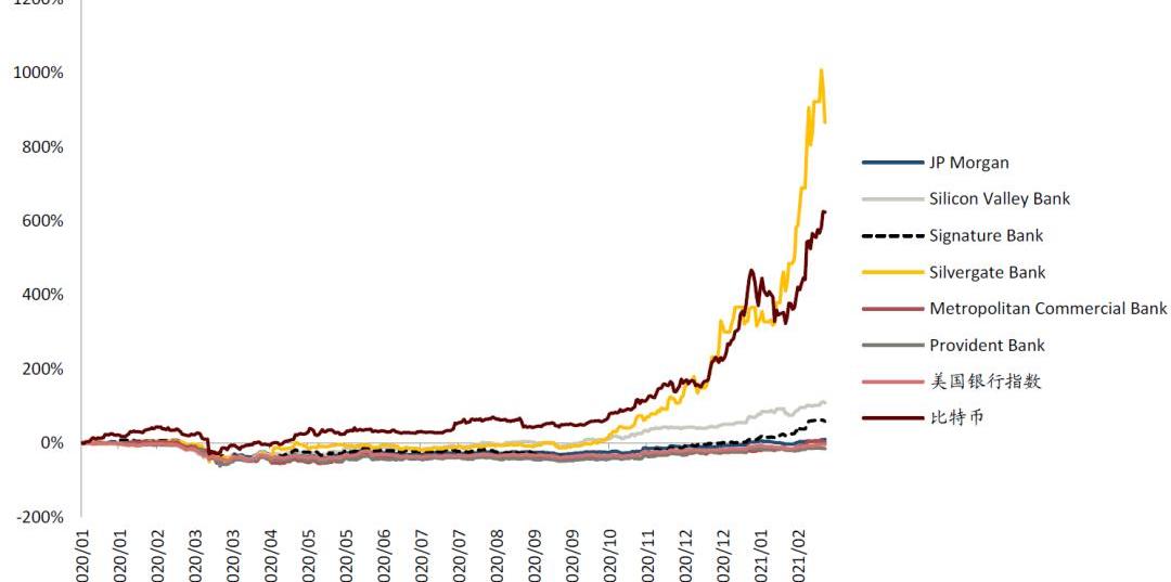 部分加密貨幣友好銀行股價跟隨比特幣價格和交易量上漲,2019/12/31-2021/2/18,比特幣價格累計上漲624%,SilvergateBank、SiliconValleyBank、SignatureBank累計上漲866%、108%、58%,對比道瓊斯銀行指數下跌4%,表現更優。