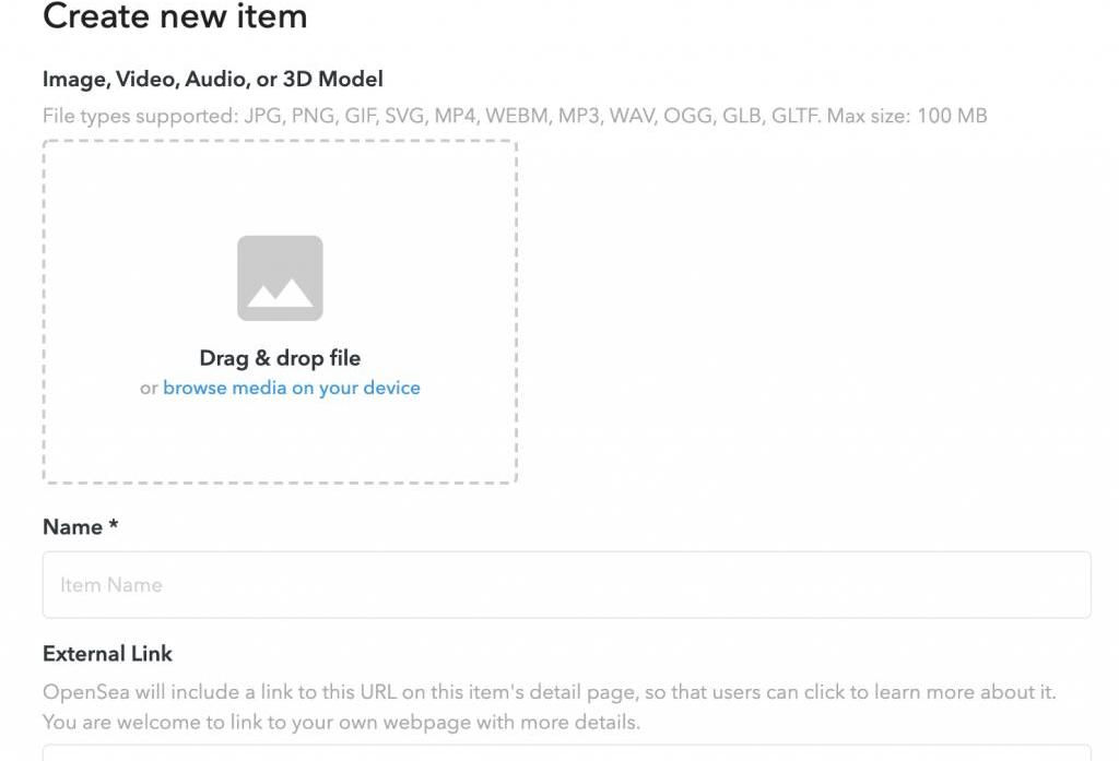 創建一個新的NFT。支持圖片、視頻、音像和3D模型文件等多種類型,文件大小上限為100MB。
