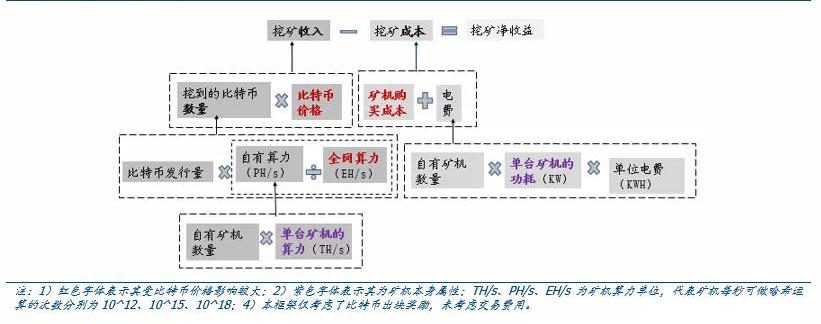 影響比特幣礦工賬面收益的因素主要是礦工所能挖到的比特幣的數量和比特幣的價格,而前者的影響因素主要是礦工所持有的算力占全網算力的比例,這一比例越大,礦工在全網記賬權的爭奪中獲勝的概率越大,能挖到的比特幣的數量越多。