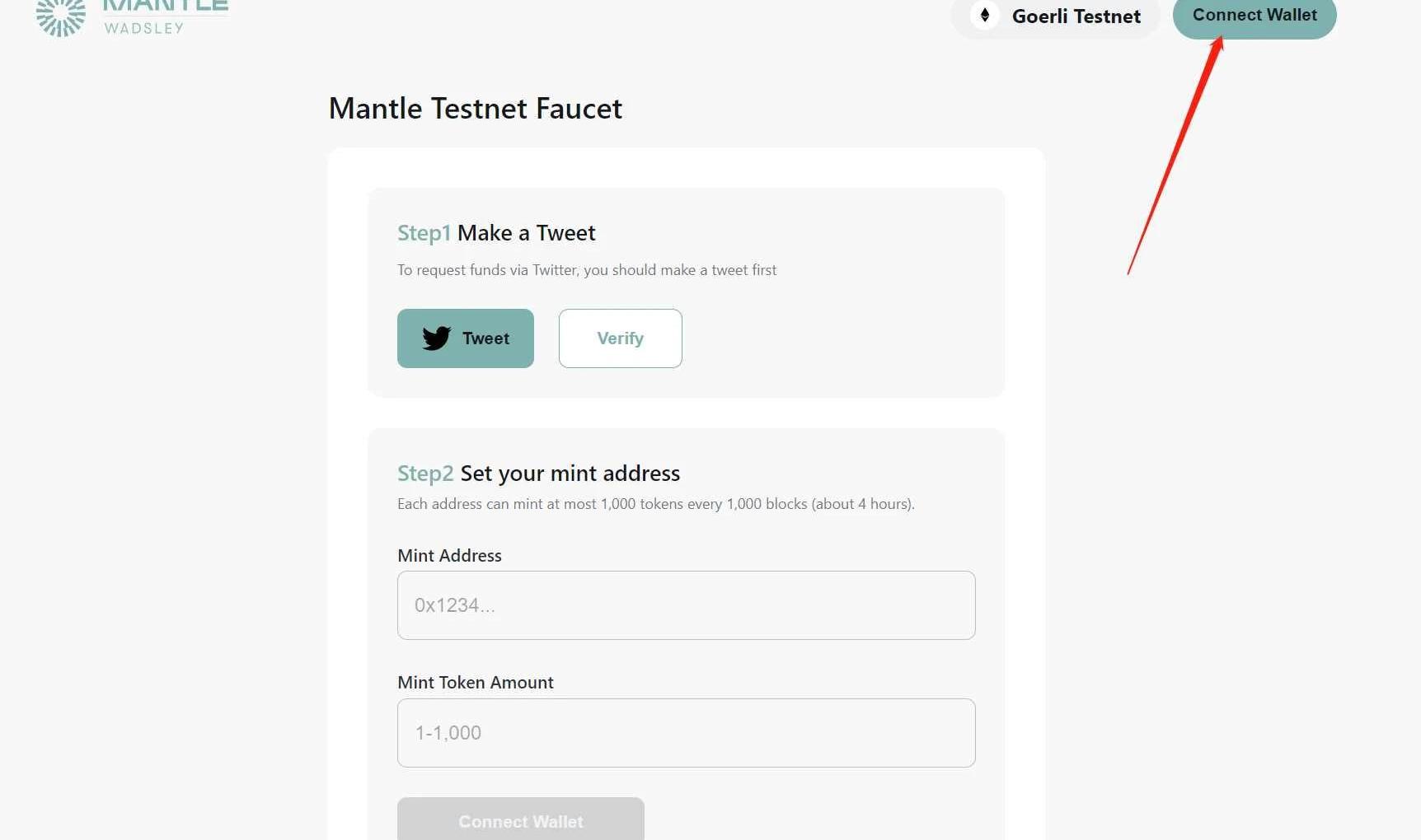 3)領取$BIT測試幣faucet.testnet.mantle.xyz,連接OKXWallet錢包