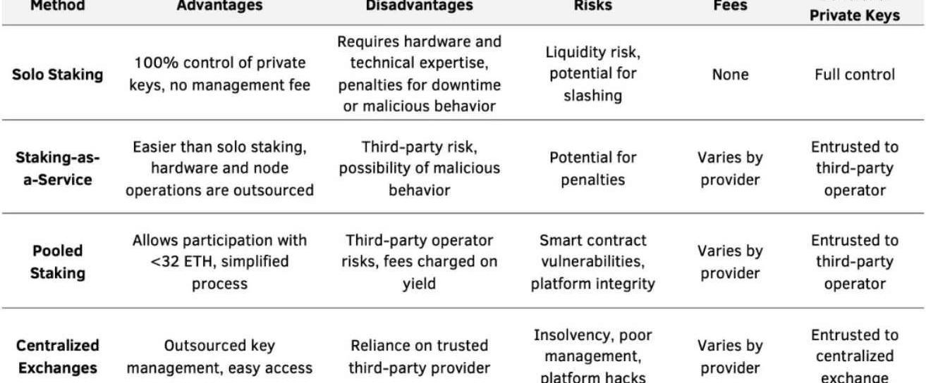 ETH的質押是實現財務自由的最佳風險和收益調整機會,我建議按如下優先順序進行操作:·保護ETH存款·放任不管·最大化ETH的收益不要追求最高收益率,要保護ETH本金不受黑客攻擊和漏洞的影響。如果你想保護本金,可以考慮使用藍籌DeFi協議或頂級CEX。持相反意見的人認為,如果你的本金不足1萬美元,那么你最好在CEX上進行質押或根本不進行質押,因為質押的鏈上交易費用可能會吞噬所有收益。