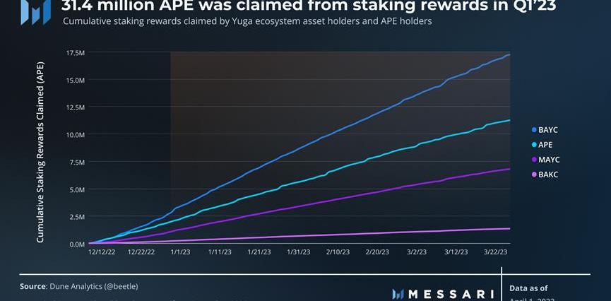 在23年第一季度,共有約5530萬APE被解鎖,其中3320萬APE在3月份被解鎖給非DAO實體,包括YugaLabs,YugaLabs創始人,三組LaunchContributors,以及JaneGoodall遺產基金會。通常情況下,這種規模的解鎖可能會增加代幣的拋售壓力。盡管占流通供應量的7.8%,但解鎖并沒有導致APE代幣出現任何異常的價格波動。相反,季度末的平均市值增長了38.7%。相對于FDV僅20.6%的增長,這一幅度的季度增長表明,總體價格波動對估值的影響,大于因解鎖分配而產生的潛在拋售壓力。領取質押獎勵