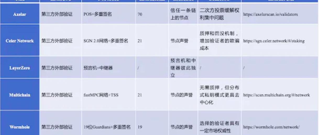 圖1損失金額排名前10的跨鏈項目通常情況下跨鏈項目匯集了大量資產,所擁有的TVL遠遠超過一般的區塊鏈協議,這就使得跨鏈項目很容易成為黑客攻擊的首選目標。跨鏈的安全性至關重要。安全性不僅來源于跨鏈解決方案本身帶來的安全性,還根植于項目決策者為預防和防控安全危機的發生所設計的安全政策。當前市場對跨鏈的需求主要面向數字資產,但跨鏈不僅局限于資產的轉移和交換,隨著區塊鏈承載的職能越來越豐富,區塊鏈的跨鏈一定會從當前的資產跨鏈,發展到消息跨鏈和功能跨鏈,從單一類別數據的跨鏈發展到通用數據的跨鏈。目前市場已有跨鏈項目開始布局消息跨鏈領域。如Axelar、CelerNetwork、Layerzero、Multichain、Wormhole、ChainlinkCCIP、PolkadotXCMP以及CosmosIBC等。由于ChainlinkCCIP的開發開發仍在進行中,PolkadotXCMP以及CosmosIBC主要適用于同構區塊鏈之間的跨鏈,因此本文主要對Axelar、CelerNetwork、Layerzero、Multichain和Wormhole這5個更具有拓展性的消息跨鏈項目進行安全性相關內容的梳理和總結。一、跨鏈解決方案帶來的安全性