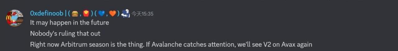 在V1版本中,Pendle部署在了Ethereum和Avalanche上,當時與兩個公鏈上的部分項目達成了一些合作。比如,在Avalanche上,與BENQI達成合作,上線了qiAVAX和qiUSDC兩個池子。BENQIDAO將其持有的價值25萬美元的USDC和AVAV部署到了Pendle的qiUSDC和qiAVAXpools中;與TraderJoe也達成過合作,上線了xJOE池,并在TraderJoe建立了PENDLE/AVAX池。在最新的V2版本中,現階段Pendle只部署在Ethereum和Arbitrum上,之所以做出這樣的選擇,可能跟Avalanche現階段的生態狀態有關系:Avalanche的TVL不足10億美元,其原生DeFi中,最高TVL的項目是Benqi,其鎖倉量約為2.4億美元,跟Arbitrum當前接近23億鎖倉量、最大TVL項目—GMX接近6億美元鎖倉量差距明顯。這樣的觀點也得到了社區相關人員的正面回應。