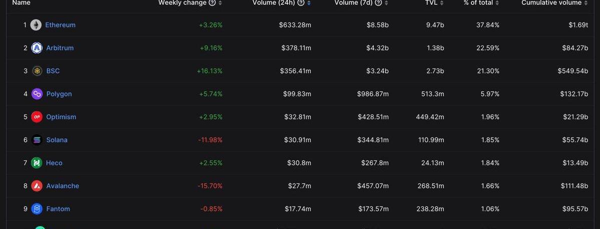 在過去的一年里,Arbitrum是我密切關注的鏈。因為現在是DEX交易量排名第二的鏈,而且所有指標都在繼續向上飆升。