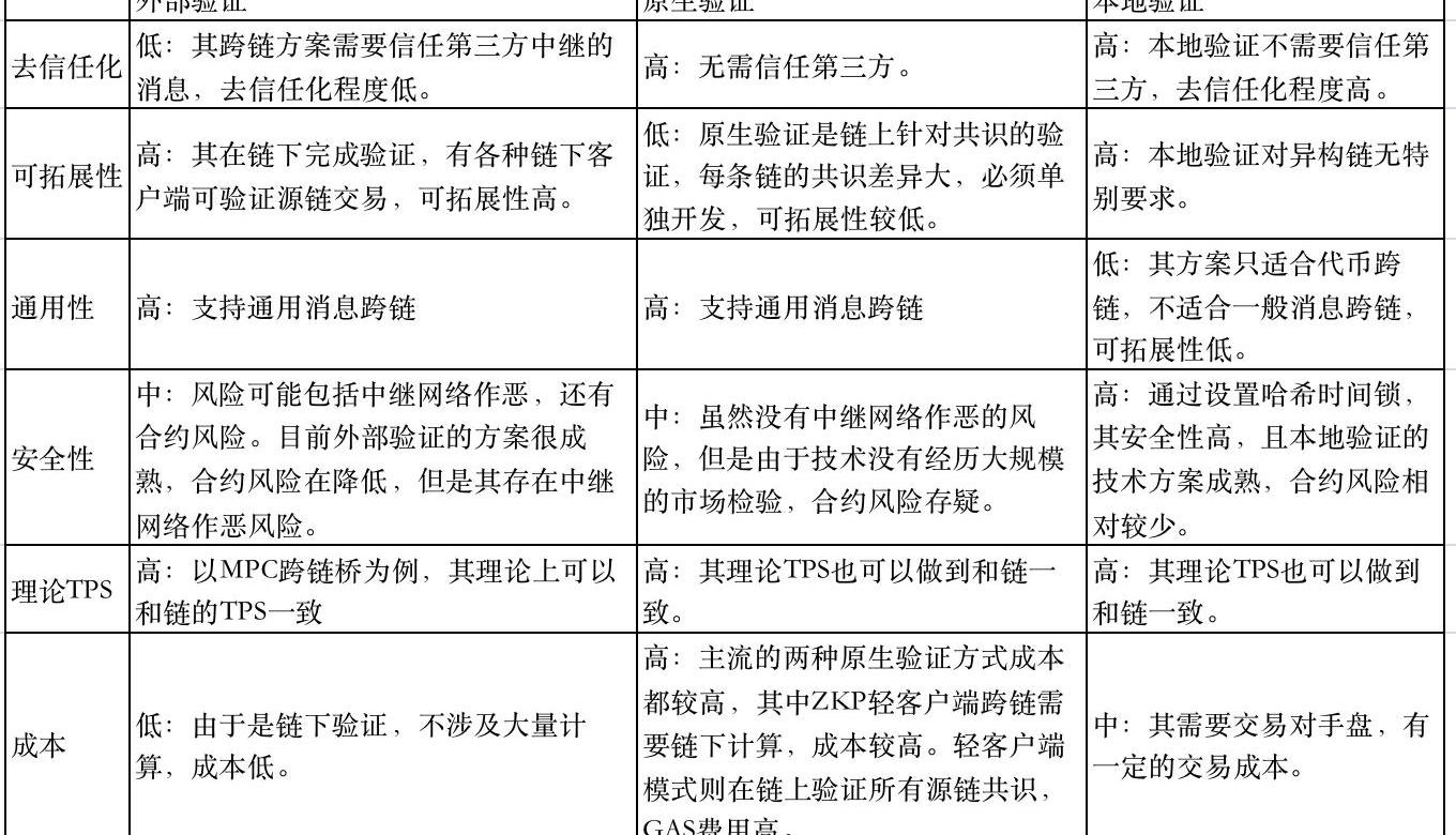 原生驗證是指在目標鏈部署源鏈輕節點,由目標鏈的輕節點對源鏈消息進行驗證,原生驗證無信任假設,理論上用戶只需要信任源鏈共識和目標鏈共識,并且確保源鏈和目標鏈不發生回滾。原生驗證的典型項目有RainbowBridge,近兩年基于ZK的跨鏈方案也屬于這一范疇,典型的ZKP跨鏈項目包括zkRouter、SuccinctLabs、Nil;Foundation等。三類跨鏈互操作協議驗證方式的綜合比較見表1所示。表1跨鏈互操作協議三類驗證方式綜合比較