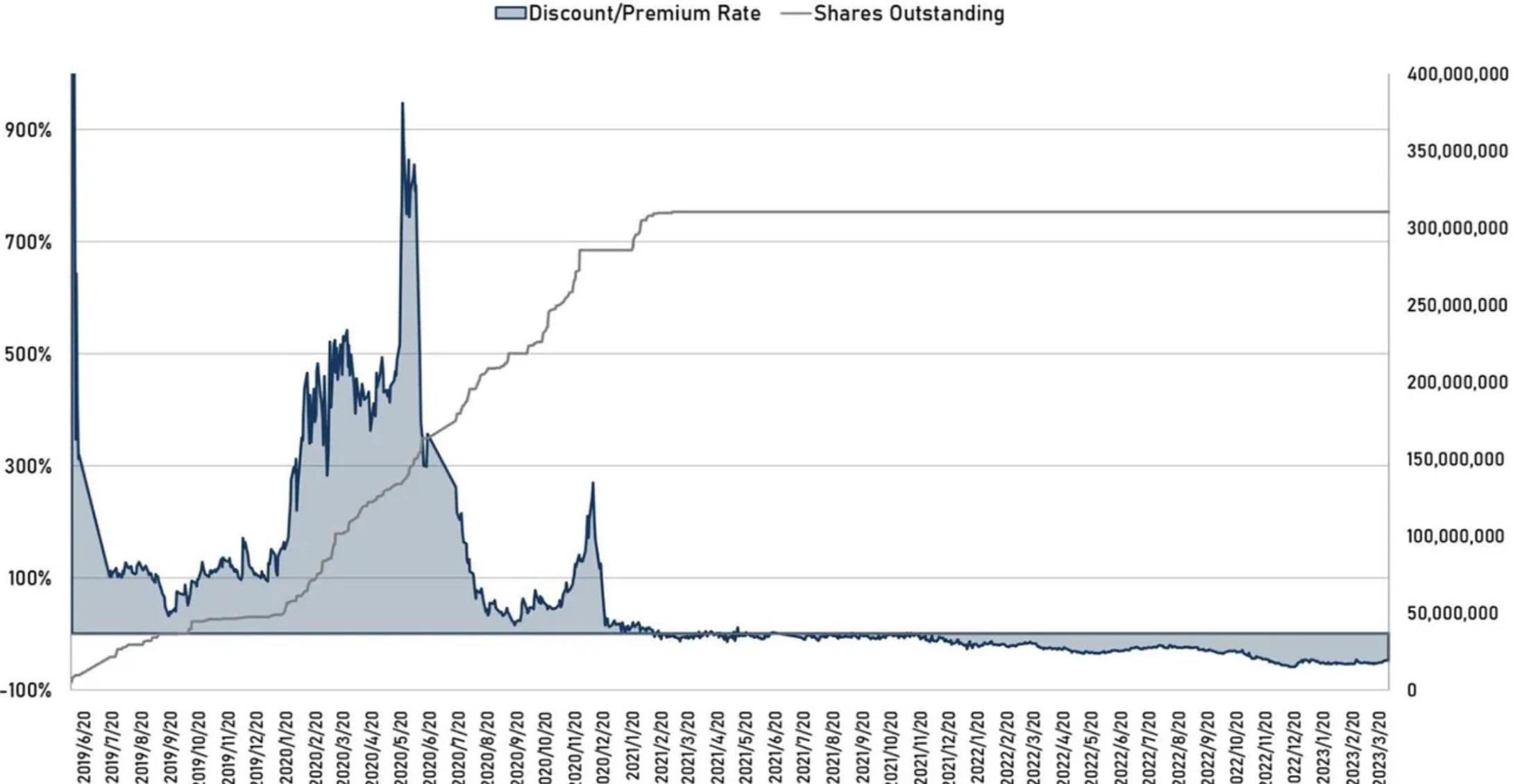 理論上ETHE價格應該圍繞ETH持倉價值上下波動,但實際上它的二級價格表現并非完全貼市,自ETHE2019年上市以來,歷史上曾經長時間維持著對ETH的正溢價,2019年上市之初一度超過1000%。自2021年2月后ETHE進入負溢價模式,并持續至今。圖1:歷史ETHE折溢價與ETH價格走勢