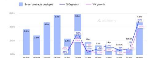 2022年,以太坊編程庫的開發者活動增加了178%,下載量達到150萬次。盡管市場不景氣,但開發人員已經加強了現實世界的解決方案,并繼續以驚人的速度在以太坊上構建智能合約,到2022年第四季度達到460萬次部署。