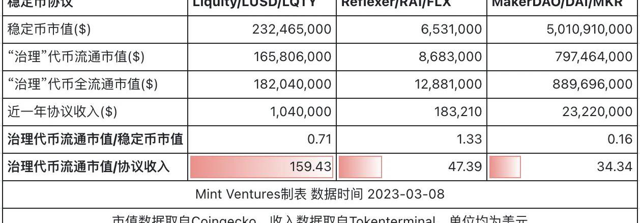 相比其他的穩定幣項目,Liquity本身協議的創新之處很多,部分特性也存在不小的爭議,也給協議帶來了一定的競爭劣勢。3.4.1無治理無治理是Liquity一個非常值得討論的特性。Liquity對于無治理的堅持是非常徹底的,包括團隊自身并不運行任何前端,以及協議參數都是由預先寫好的算法來進行更新,任何人都不可能更新Liquity協議的代碼,因而代幣LQTY并沒有治理功能,而僅是分享協議鑄造和贖回費的收入。無治理當然給Liquity帶來了諸多好處,包括:避免個別人或者小團體的行為與整個協議的長期目標產生沖突,也可以避免無聊的協議。前者的例子數不勝數,如Uniswap的DeFi教育基金事件、SushiSwap以及Abracadabra團隊出現的信任問題等等;后者的典型例子,是在Uniswap跨鏈到BNBChain時跨鏈橋選擇的整個過程,不同的利益群體圍繞到底選擇Layerzero和Wormhole的討論和投票。協議安全性得到了進一步保障。Liquity至今運行2年,從未出現過任何安全事故,這在借貸/穩定幣協議里可以說是非常罕見的,穩健如Compound也曾經因為激勵參數的問題導致COMP過量增發。并且由于Liquity并不更新代碼,隨著時間流逝,代碼出現問題的可能性就越來越低。協議層面更進一步的去中心化。在目前的Dapp架構中,前端模塊對中心化服務還會或多或少的有依賴,而由于Liquity并不運行任何前端,從協議層面就可以更加免除對中心化服務的依賴。從現實例子出發,這點的明顯好處在于,Liquity可以避免類似在OFAC制裁TornadoCash事件后,Uniswap和Aave等協議由于部分API供應商的錯誤,而導致誤封禁部分用戶的情形。筆者說無治理可能是Liquity的缺點,主要是因為無治理的特性會限制Liquity協議的用例拓展,以及對新變化的適應能力。前文提到,目前LUSD的用例拓展并不算成功,這某種程度上也是因為無治理導致的。Liquity預留的儲備LQTY代幣僅為200萬枚,其余LQTY均已經在代碼里規定了用途無法更改。這就使得Liquity想要進行更多用例拓展和運營活動的抓手都不足,比如Liquity就基本沒參與Curvewar–這一2022年穩定幣領域最大的敘事。又比如,在ETHMerge以及上海升級之后,ETH將會越來越多地參與到質押中,在主網上流通的ETH可能會有很大一部分以質押衍生品的形式存在,在這種情況下,對于所有以ETH為抵押物的穩定幣協議而言,是否需要支持LSD、如何支持LSD都是需要討論的問題,但在Liquity的無治理機制之下,除非Liquity發行新版本,否則協議也無法適應這些新的變化。但如果不適應這種變化,那可能有40%-50%的ETH將無法作為LUSD的抵押物,這會更加限制僅由ETH作為抵押物的Liquity的天花板。筆者認為,愿意治理在某種層面上也是團隊愿意為項目發展承擔責任的表現,DeFi世界目前雖然已經有了一些明確的商業模式,在各個版圖內都已經有了處于絕對領先地位的協議,但是如果我們以五年乃至十年的維度來看,DeFi的發展與創新仍然是非常迅速的,各個領域的競爭者也仍然在不斷地涌現。在不斷變化的外部環境之中,一個努力盡責、并且對行業深入理解的團隊是任何項目能夠獲得長期成功的關鍵。從DeFiOG的發展歷程來看,我們也不難看出治理&團隊的重要性:Uniswap在V2已經占據市場主導地位之時,仍然推出了V3版本的產品,并且此后開始拓展NFT交易相關業務;Aave從最初ETHLend的Peer2Peer的借貸產品,到Peer2Pool產品,又到后來的Aavev3以及新發穩定幣GHO,業務形態和邊界一直在發生變化;Synthetix從v1版本的穩定幣,到v2版本在以太坊主網上線衍生品交易市場但是長期只有不足50人交易,到Optimism網絡最高達到5億美元日交易量,再到全新設計的v3版本,盡管產品形態距離他們的想象仍然有差距;Curve整個協議的設計都是圍繞著治理展開,并且團隊推出了v2版本的Curve切入非對價資產的交易,另外還準備上線crvUSD;而目前領先的“去中心化”穩定幣協議MakerDAO和FraxFinance,團隊也同樣積極地主動調整協議來應對變化:MakerDAO的穩定幣從SAI到DAI,再到312之后上線StableVault以及PSM穩定價格,上線D3M主動調節市場的供需,并且推動RWA的落地。近期MakerDAO更是準備擴展借貸業務并切入LSD市場,并且進行了組織變革–將MakerDAO拆分為更多的子DAO,以期更快地推進業務進展。盡管PSM和RWA業務的推進使得MakerDAO越來越偏離去中心化和去信任化,但是對于DAI和MKR的持有人來說,都是做了在當時當刻對協議更加有利的選擇。Frax最初是作為算法穩定幣面世的,當算法穩定幣的敘事不再被市場所認可,Frax又及時上線了AMO模塊來承擔供需調整。此后還拓展業務到FPI、Fraxswap、Fraxlend以及Staking業務,也積極地參與CurveWar,業務邊界不斷擴展,FXS代幣市值排名也一路上升。諸如上述的協議業務方向的變動或者針對協議模塊的更新,都是無治理的Liquity所難以做到的。筆者認為,無治理可以作為穩定幣協議的最終追求,當整個協議已經到達發展的成熟狀態時,無治理可以幫助協議更好地維護安全,也免除人治可能的種種問題。但是在目前整個DeFi乃至Web3領域的蓬勃發展才僅僅開始不到5年時,就主動放棄變化的權利,將會很難應對后續的環境變化和激烈的后來者競爭。3.4.2協議收費結構關于Liquity另一個值得討論的問題是無息借貸,以及無息借貸所帶來協議整體收費結構的問題。在Liquity借貸并不收取利息,而是在鑄造和贖回收取手續費,這個手續費比例由預先設定好的算法所控制,不過在Liquity協議運行的絕大多數時間都是0.5%。縱觀所有