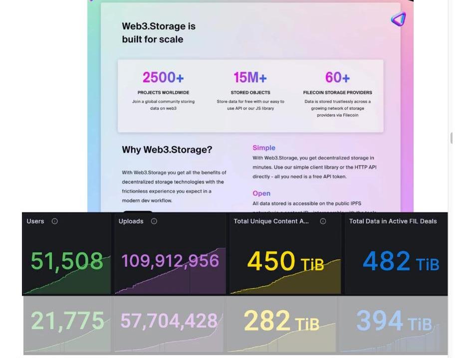 有很多用戶在使用Web3.storage,它是單一的、針對小型的應用。之前我們有2萬名用戶,現在已經是5萬名用戶,有超過2倍的用戶增加,而且在網絡上有接近1億上傳量,對于Filecoin來說是非常巨大的數字。當然這上面有很多不同的應用,比如游戲、視頻、音樂、社交媒體的應用,我們可能使用這樣的網絡進行備份,把所有的數據服務于應用。